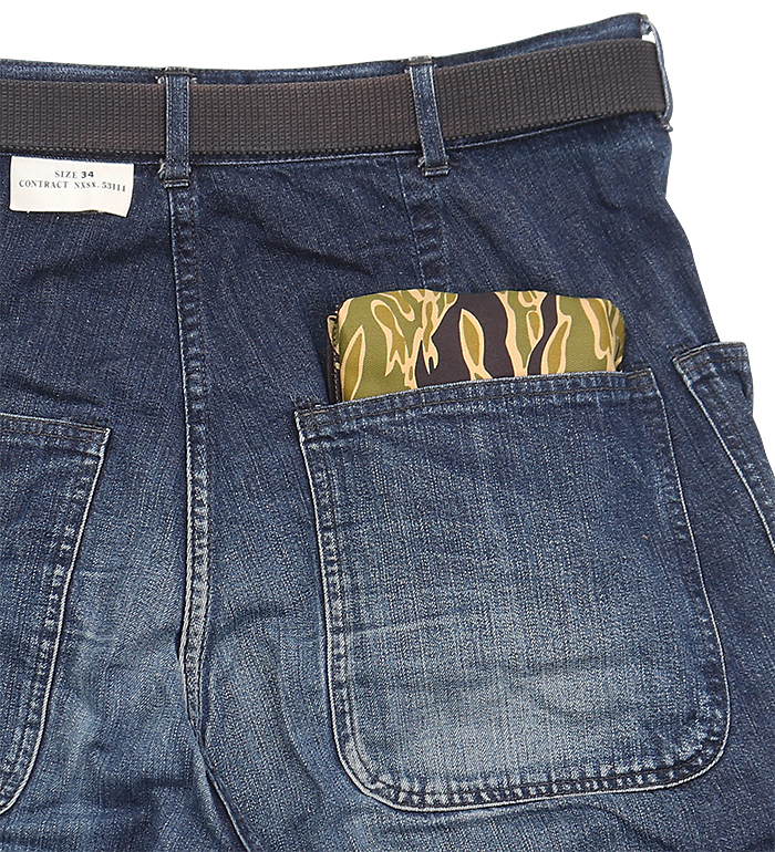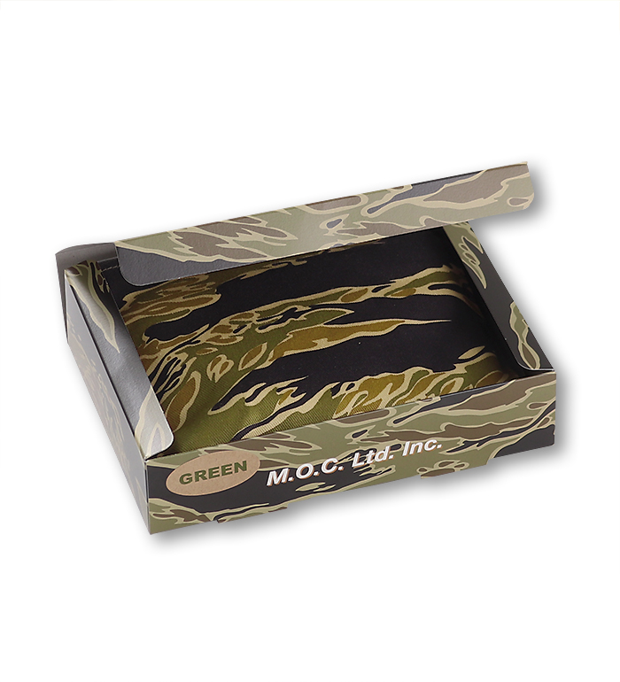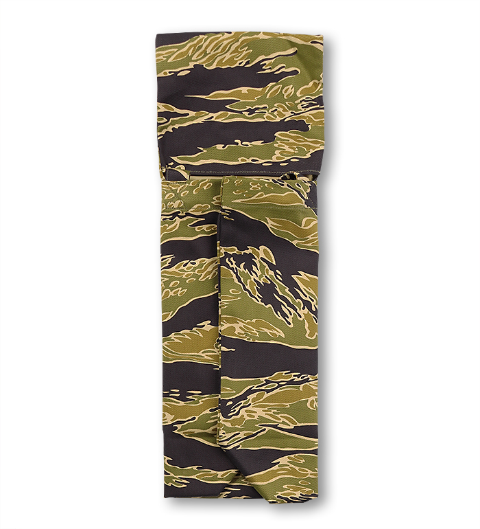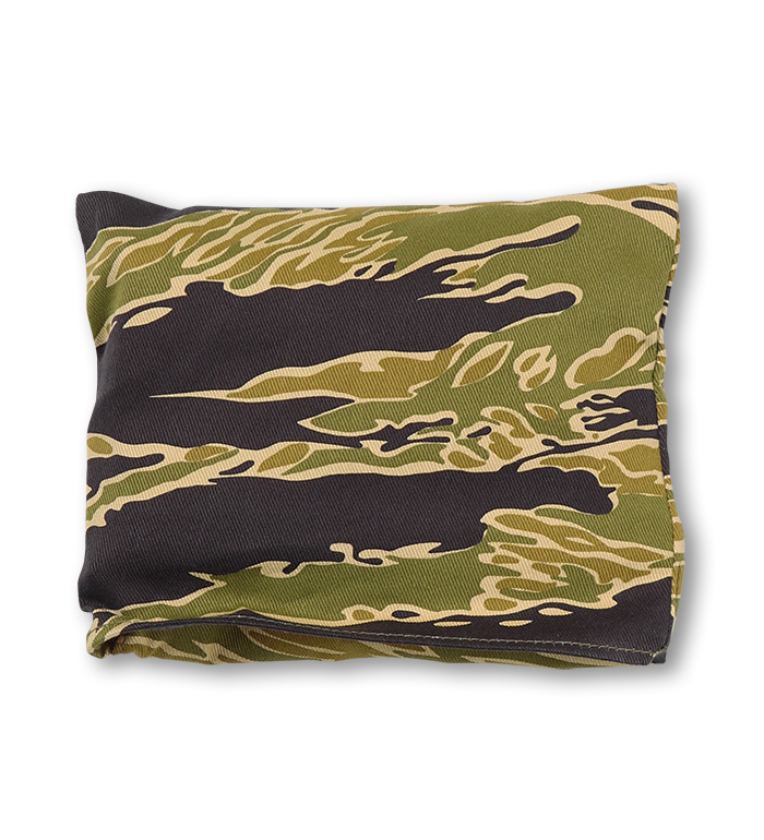 綿布のカーキ色、タイガーの呼称の所以である黒、もっとも迷彩効果があると考えられる緑、ジャングルの間から見え隠れする地面の茶、4色で構成された迷彩パターン"Gold Tiger"。無限とも云える組み合わせの中から生まれた2種のExperimental(試験的)パターンで制作された"Gold Tiger Tote Bag, Green Shades"の紹介です。