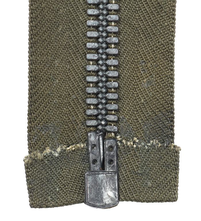 ご案内は軍に納入された後、一度も使用されずに放出に至った実物・未使用品であり、40年代後期製造の『CROWNジッパー』としてはこれ以上のコンディションの物は望むべくもありませんが、製造されてから75年を経過する実物ジッパーです。使用に差し支え無い範囲においての金属部の変色、テープ部における保管汚れ、僅かな変色、製造時よりの織りキズ等があること、また初期のCROWNジッパーにおける下部折り返しのテープ貼り付けに用いられた接着剤のはみ出しがあること、予めのご了承お願いいたします。