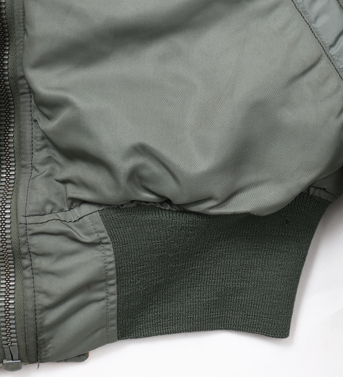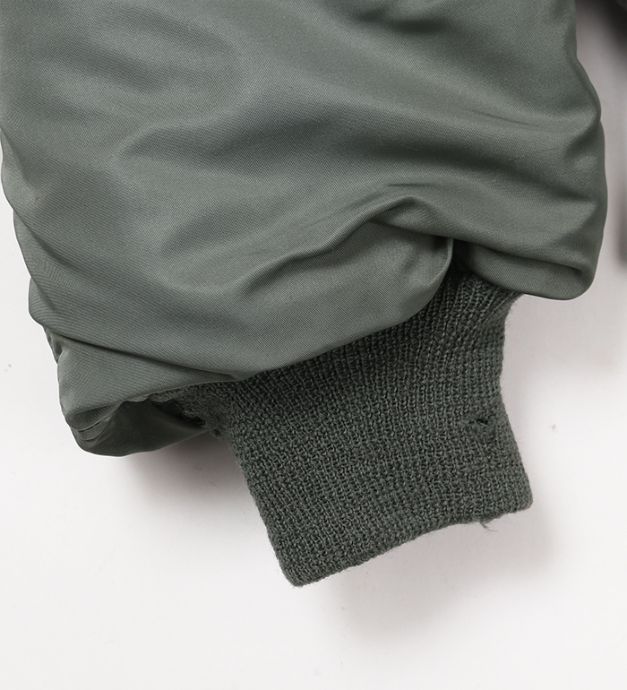 MA-1, L-2B, N-2B…が最も活躍した60-70年代、当時のフライト衣料に多く用いられたセージグリーン色、編み仕様を再現。袖口、腰回り共に交換される方のため同じ製造ロットで組んだ2点セット、M.O.C.(MASH)復刻品。