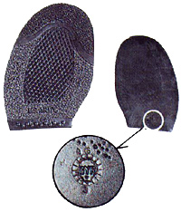 ヒールに関してはTYPE I では茶色のラバーヒールも多く使用されたが、TYPE II 以後は全て黒のラバーヒールが用いられた。その表面のトレッドデザインは軍で規定された形跡はなくメーカー名あるいはそのトレードマークがヒール・トレッドとして象られた物が多い。ヒール固定用釘穴の数は常に13(片側)でありその位置も各メーカー共通であることから釘穴に関しては規定されていたようだ。ヒールに関しては TYPE II、TPE III、バックルブーツの全てにおいて同型式の物が多く使用され、NAVYの物にも多く見られる。又、空挺ジャンプブーツのヒールはジャンプ時のひっかけ防止のためヒール前部は通常の物のようにはカーブせずストレートであり、そして斜めに勾配が付けられていた。MCのラフアウトブーツに使用されたヒールは取付釘ガイドホールのない物が多く、これはMCの主作戦地が多湿の太平洋戦線であったため釘ガイドホールからの水の進入を嫌った物だと考えられ、又、材質的にもMCのソール、ヒールは他の物と異なり、成型時に滑り止め用に細かくシュレッドされた綿布などが混入された物が多かったようだ。 |