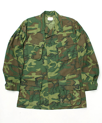 NAM戦時、採用、支給されていたERDLカモ柄(通称リーフカモ)の熱帯地用野戦ジャケット。色調はグリーンリーフ又は初期リーフと呼ばれるグリーンの色調が強いタイプで、R/S(リップストップ)生地製。実物USED放出品。