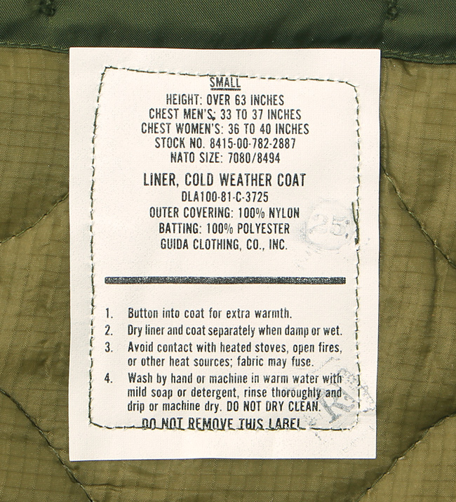US(米軍) M65フィールドジャッケット ライナー/OD/DLA-81/Small/実物・未使用