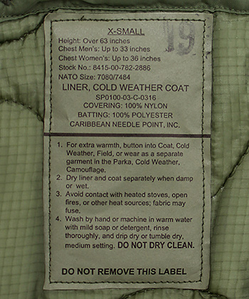 ご案内は一度も使用されずに放出に至った実物・未使用品であり、実物軍物の中にあってはこれ以上のコンディションの物は望むべくもありませんが、製造され納入されてから10年以上を経過する物達です。使用又はコレクションに差し支え無い範囲においての些細な保管汚れ、キルティング生地の薄さから生じる小傷、生地ホツレ、僅かなステッチホツレ及び軍での検査時におけるラベル上への手書き文字記入等があること予めの了承お願いいたします。