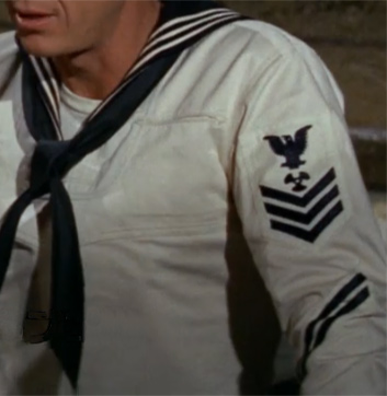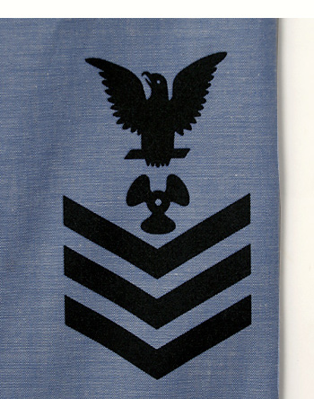 米海軍における下士官クラスの階級及び職能を表す徽章を『Rating/Rate』と呼びます。今回熱転写で左袖上部にプリントされる『Rating』は階級1st Class(1等海曹)、職能Machinist(機関士)を表し、ご存じ映画