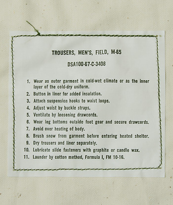 米軍において1965年にM-65ジャケットと共に採用されたフィールド・パンツ。本来、防寒用で、極寒時にはライナーを取り付ける為、ファティーグパンツ、BDUパンツより太めのシルエット。フロントジッパーアルミタイプ。1967年コントラクトの実物未使用デッドストック放出品。