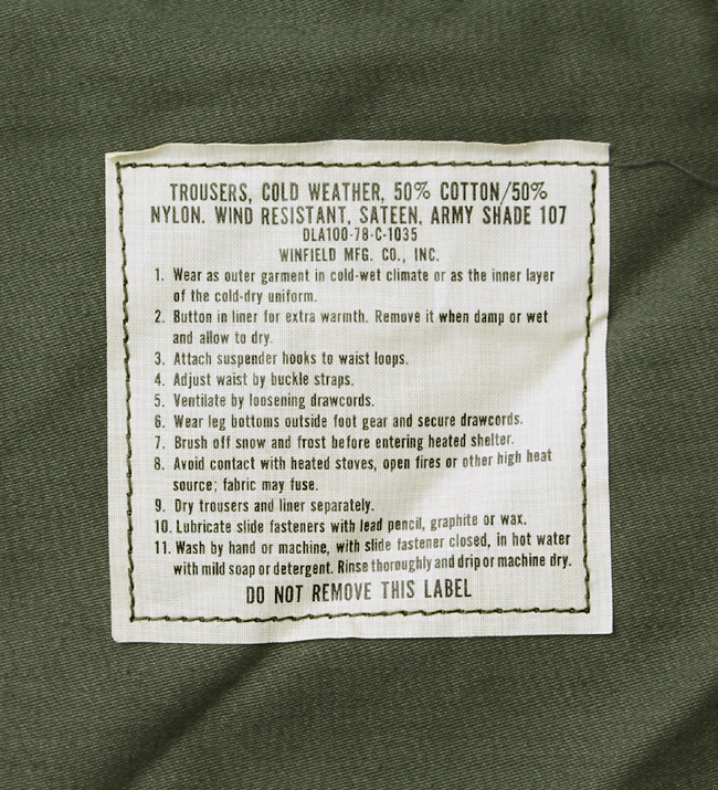■制式名称:TROUSERS, COLD WEATHER, 50% COTTON/50% NYLON. WIND RESISTANT, SATEEN, ARMY SHADE 107