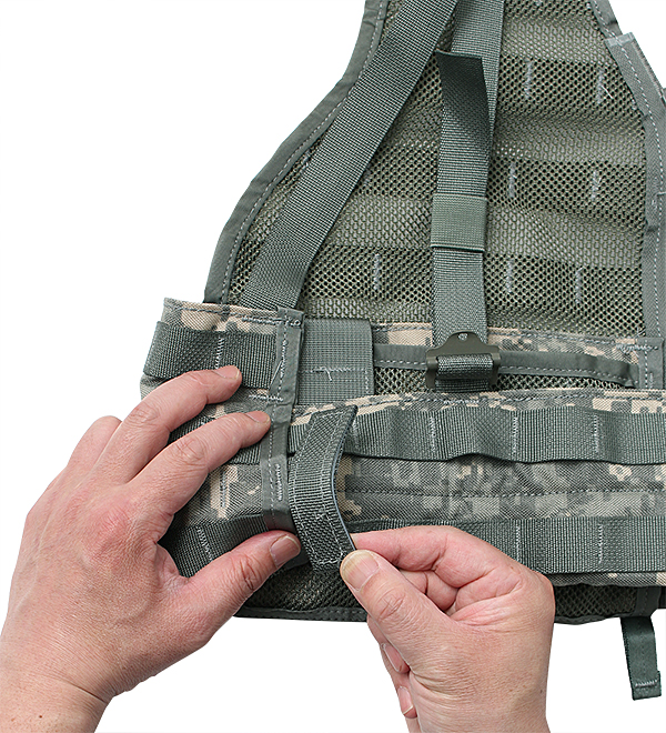 ・ウエストベルト長さ調節:ベスト後部、両サイド調節用ストラップを画像のように指先で持ち上げベルトから一旦外しベルトの長さを調節した後、調節用ストラップを再びベルトテープ部にはめ込む。