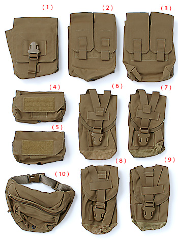 ・パウチ類の基本取り付け:PALS式と呼ばれる、ドットボタン付きのナイロンストラップをベスト等に縫いつけられたストラップに交互に通し装着。