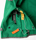 ●正面右サイド:シリンダー(圧搾ボンベ)等機能部収納部(※黄色いストラップ部分にオレンジ色のホイッスルあり)/右上画像参照