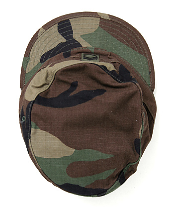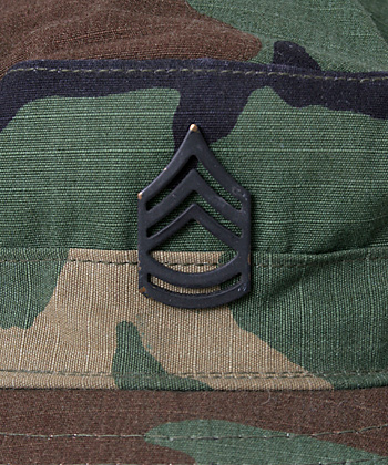 一般にレンジャーキャップと呼称される米陸軍のウッドランドカモ柄ホットウェザー・フィールドキャップ。正面にSFC(一等軍曹)の階級章(メタル or 刺繍)付。実物極上放出品。