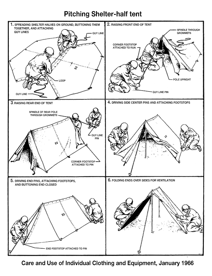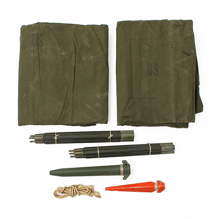 そのコンパクトのサイズから兵士間で“Pup Tent” (子犬のテント)と呼ばれて来た、携帯組立米軍テント。1920年代から2005年頃までその型式は殆ど変わらず、各兵士に支給されるシェルターハーフテント(半割テント)を2個組み合わせ、一張のテントとして使用する野戦用テント。慣れた兵士なら5分程度で組み立てる優れ物だ。