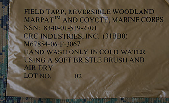 米海兵隊、最新 フィールド・タープ。本来の目的は作戦時、雨から兵士達を守るため簡易カバー/テントとして用いられるが、片面がウッドランド・マーパット、裏面がコヨーテブラウン、2m四方のナイロン地は上空からの迷彩具として使用される事も想定した造りだ。