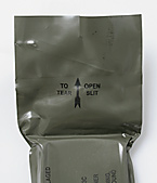 米軍における現用の野戦用包帯。OD色のビニール素材製パッケージ入り。