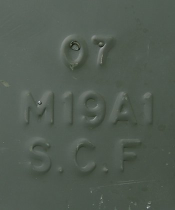 2000年代以降に製造・納入されたグリーン味が強いOD色の現用Cal.30(7.62mm弾)用AMMO BOX。正面にマーキング、サイドに製造年次、形式表記あり。実物未使用放出品。