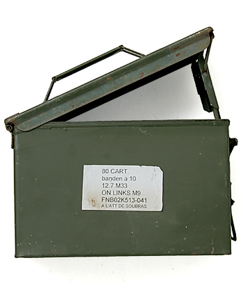 1990年代以降に製造・納入されたグリーン味が強いOD色の現用Cal.50(5.56mm弾共用)用AMMO BOX。正面に内容を示すマーキング(紙ラベルの張り付け又はペイント)が、サイドに製造メーカーの刻印等あり。本品は米軍も含めたNATO所属のUN(国連平和維持軍)用調達品。実物USED放出品。