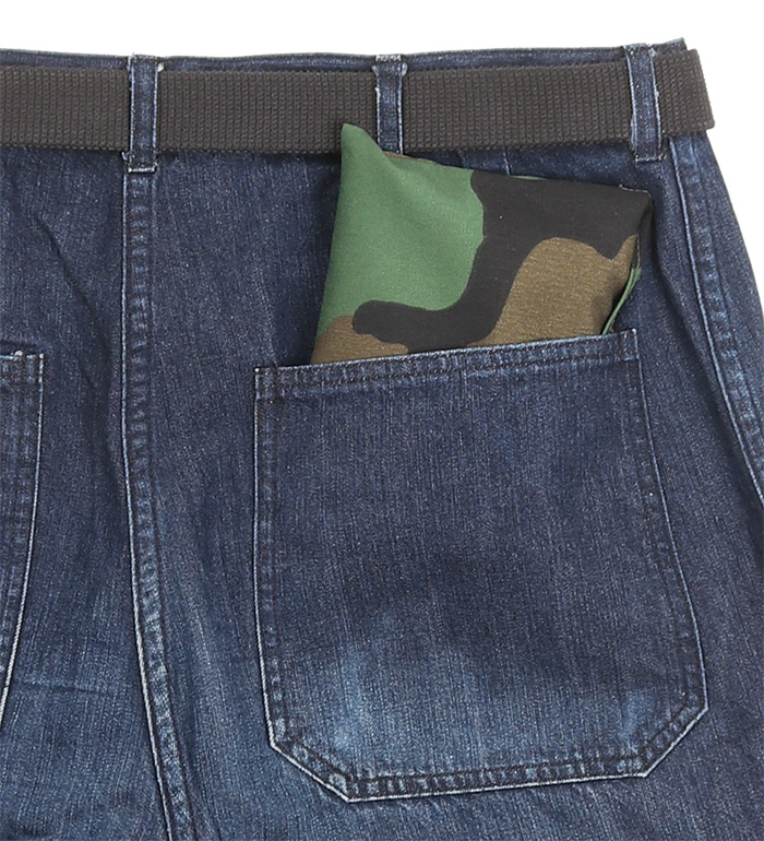 収納されたバッグはジーンズのヒップポケットに収まる大きさです。