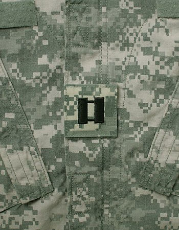米陸軍における現用最新迷彩柄ACU用の階級章。将校、大尉用。刺繍製。大戦時より、米軍への代表的な徽章製造・納入メーカとして知られる、VANGUARD社製、実物・未使用品