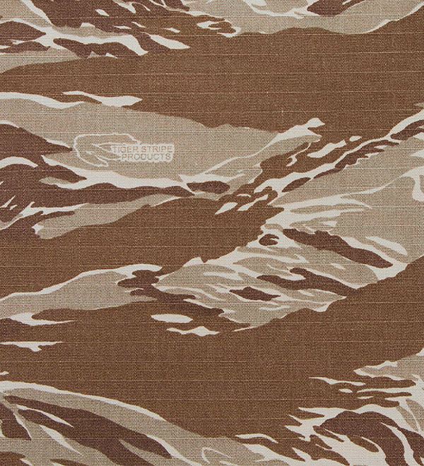 ■迷彩柄:映画“The Green Berets(グリーンベレー)”で“ジョン・ウェイン”が着用したことから一般に『ジョン・ウェイン-パターン』と呼ばれるタイガー迷彩柄を再現したことで知られる“Tiger Stripe Products社”が米軍特殊部隊の要請で製作を行った『デザートタイガー』。生地は『R/S織り』。その迫力は長年『NAM戦タイガー復刻メーカー』として知られた“Tiger Stripe Products社”ならではのものがある。