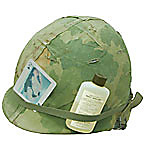 NAM戦初期における米軍の伸縮性素材により作られたヘルメットバンド。バンド後部に通称“キャッツ アイ”と呼ばれ夜光テープの縫い付けの無い初期仕様品。ヘルメットに装着し、木の枝や葉っぱ等を差してカモフラージュ(擬装)に使用。