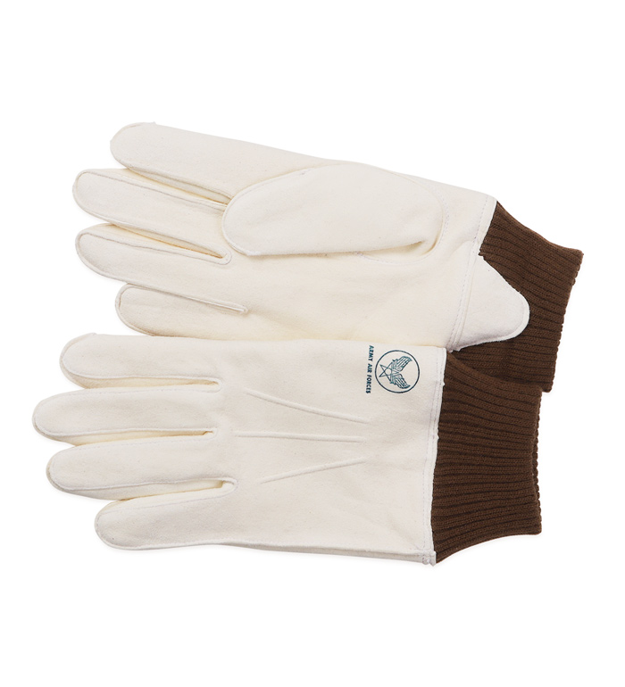 1938年採用時の雰囲気を漂わせた『A-10 グラブ、ホワイトディアスキン』、ゴート(山羊革)に比較し格段に使い勝手の良い鹿革(裏面使い)。その純白の革面がもはや白とは呼べないほどに汚れた頃、ルーキーはベテランパイロットの仲間入りを果たす。