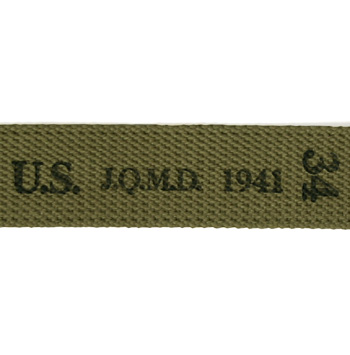 1937年米陸軍において採用されたカーキカラーの『GI トラウザーズ・ベルト』。大戦時と同仕様、同色で織り上げられた『1 1/4インチ幅・コットンベルト』と現在も同型の物が継続使用されている米軍実物バックル&エンド金具(チップ)を組み合わせ復刻された『大戦型GIトラウザーズベルト』。ベルト裏には米軍官給品を表す『U.S. J.Q.M.D』と共に現存する実物に最も多く見られる年号『1941』がマーキングされている。