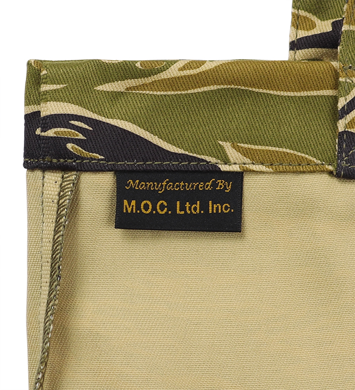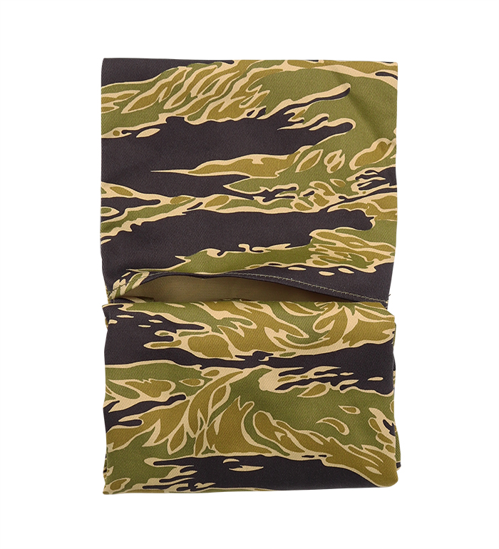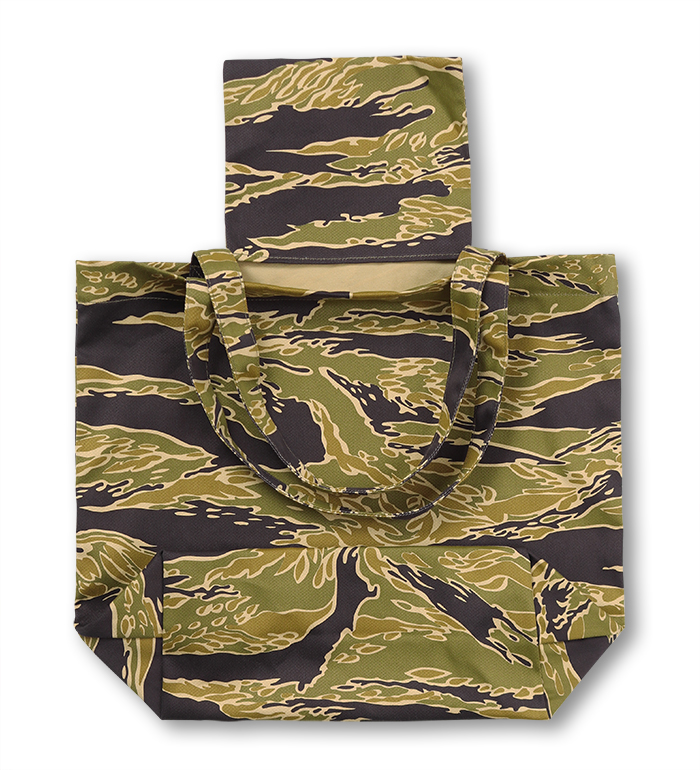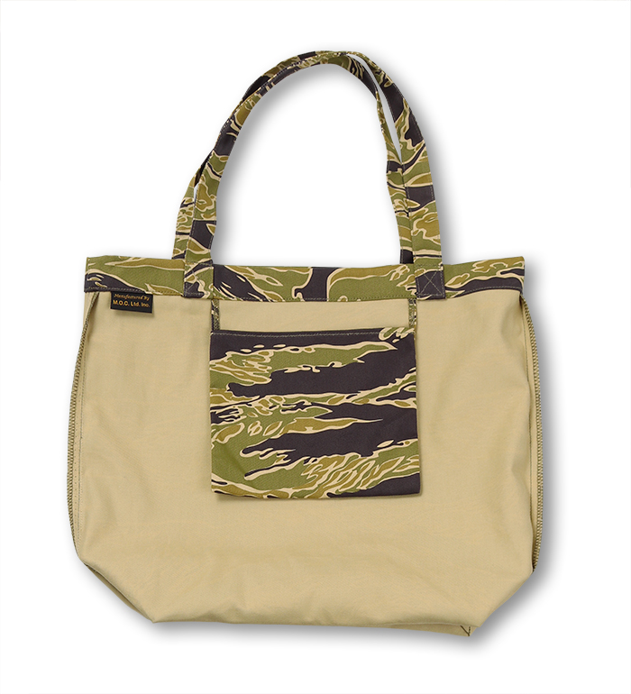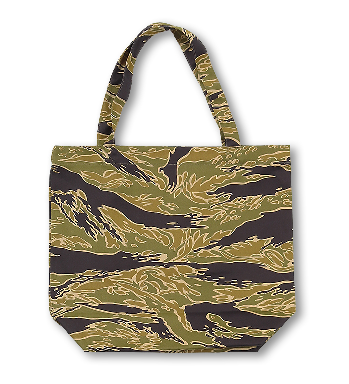 綿布のカーキ色、タイガーの呼称の所以である黒、もっとも迷彩効果があると考えられる緑、ジャングルの間から見え隠れする地面の茶、4色で構成された迷彩パターン"Gold Tiger"。無限とも云える組み合わせの中から生まれた2種のExperimental(試験的)パターンで制作された"Gold Tiger Tote Bag, Green Shades"の紹介です。