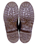 特徴ある「しぼ(シワ目)加工」された表面の厚手一枚革使用。ソールはラバー製(トレッドは写真参照)。