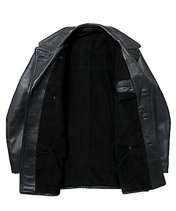 大戦時ドイツ海軍(Kriegsmarine)において、Uボート(潜水艦)乗組の将校用に採用、支給されたダブル襟の本革製ハーフコート。ドイツの大手映画衣裳会社所有の40〜50's実物ベースの放出品。
