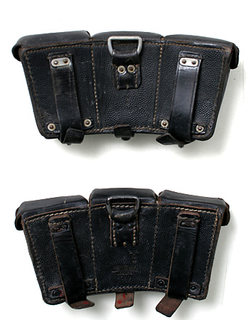 大戦ドイツ軍における主力ライフル モーゼル Kar 98K用3連 弾薬盒(アムニッション・パウチ)。 海軍(KM)用で黒革の縫い止めタイプ。ペア(2個組)。実物・極上品。