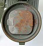 ■本体:鉄製で蓋付き。側面にストラップ装着用フック部が3箇所(上/2、下/1)あり。