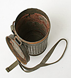 大戦ドイツ軍において採用、支給されていた筒型、円筒状の個人装備用ガスマスク・ケース。後期長寸(M38)型でキャリング・ストラップ(戦後BWの同型品)付。実物USED品。