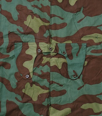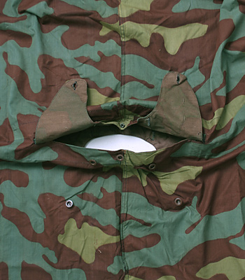 イタリア軍において戦後も大戦時と同型、同カモ柄で継続採用、支給されていたカモポンチョ兼シェルター・ハーフ(個人用携帯天幕)。中央開口部のあるタイプ。実物未使用放出品。
