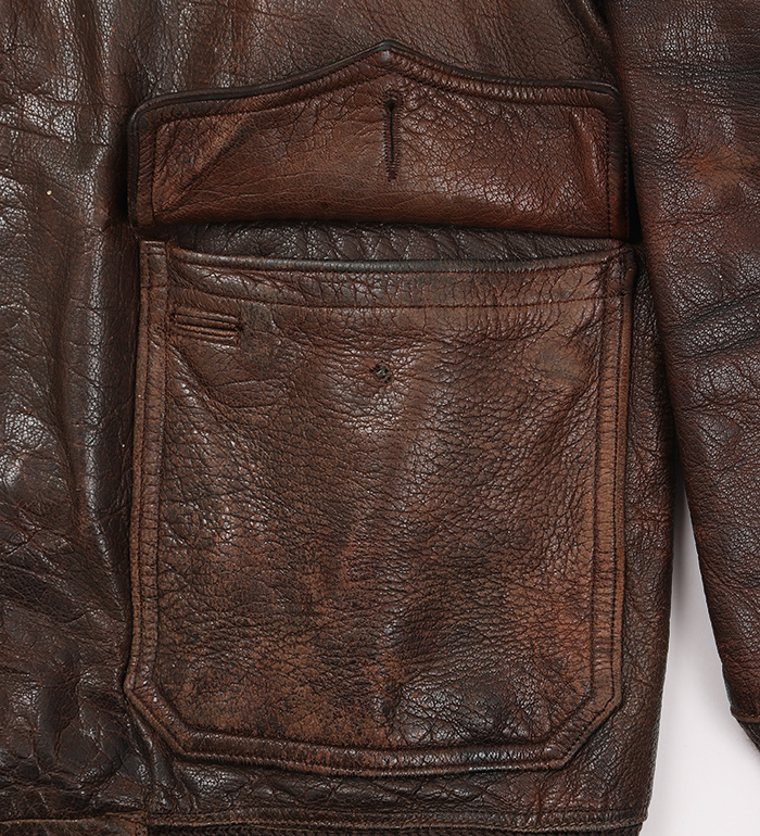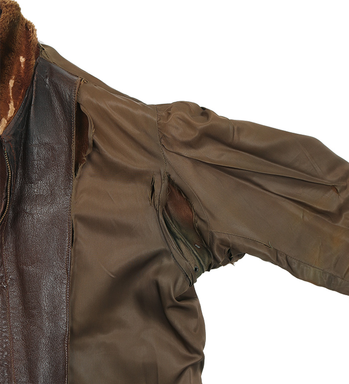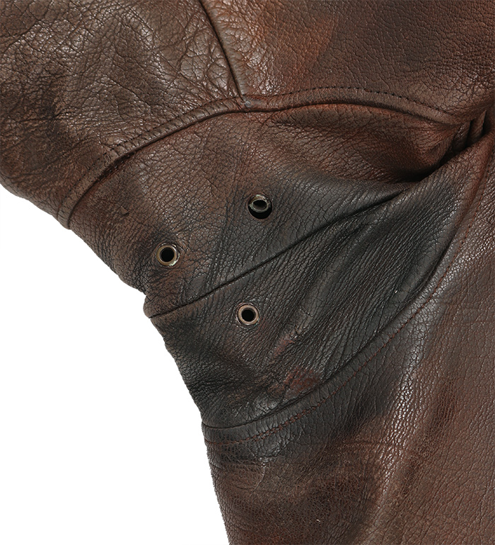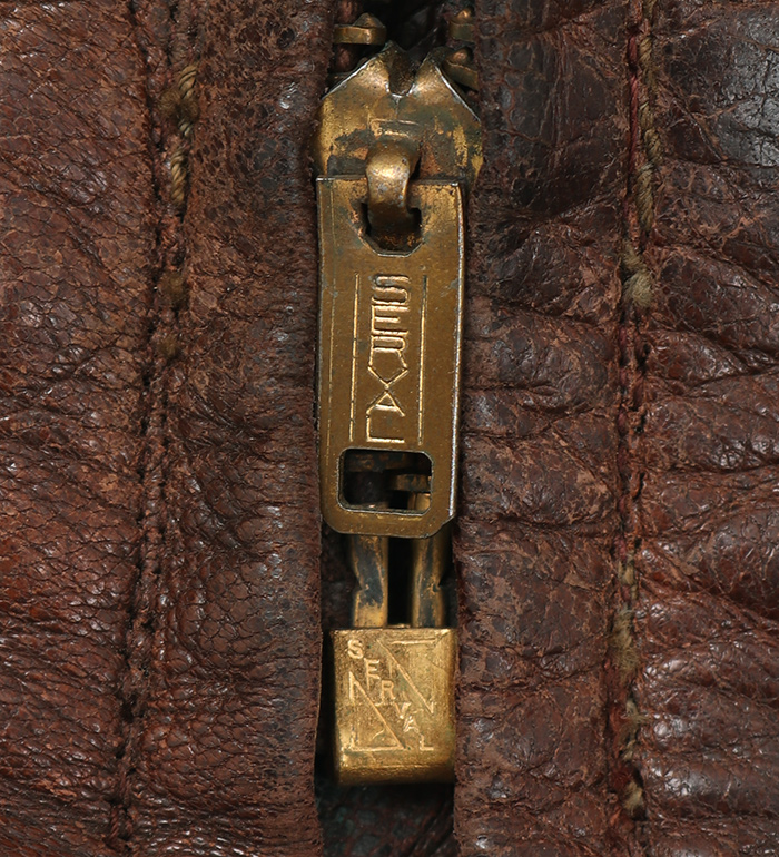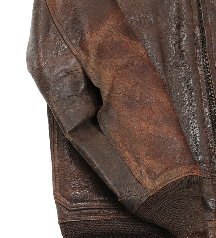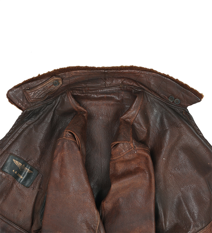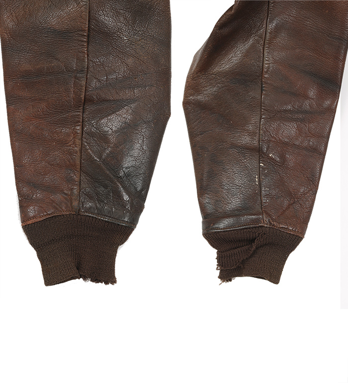 ご案内は大戦初期に製造支給された革ジャケットとしては稀有ともいえる良好なコンディションですが、軍務で実際に使用されたレザーフライングジャケットです。使用又はコレクションに差し支えない退色、擦れ、小傷、小汚れ、小虫食い、小補修痕、ムートン部の毛抜け、及び縫い糸の経年劣化によるステッチ欠落や緩みの発生、金属部分に若干のサビ緑青の発生、等があること予めのご了承お願いいたします。