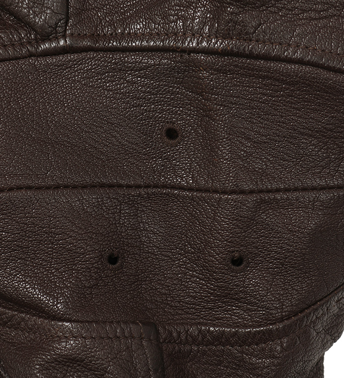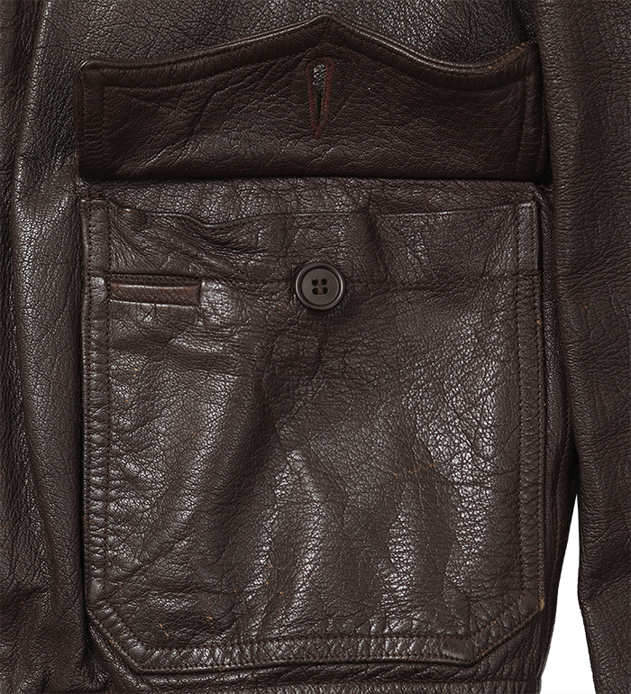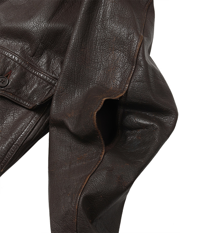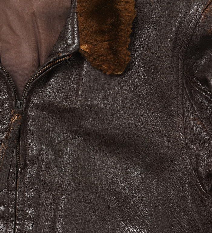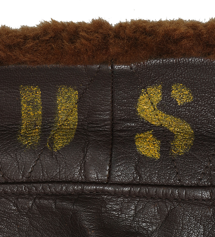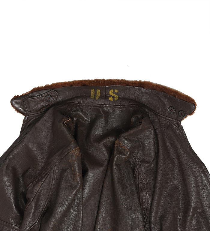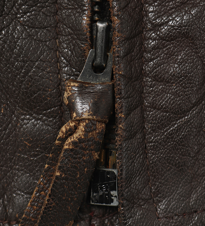 ご案内は大戦後期に製造支給された革ジャケットとしては稀有ともいえる良好なコンディションですが、軍務で実際に使用されたレザーフライングジャケットです。使用又はコレクションに差し支えない退色、擦れ、小傷、小汚れ、小虫食い、小補修痕、ムートン部の毛抜け、及び縫い糸の経年劣化によるステッチ欠落や緩みの発生、金属部分に若干のサビ緑青の発生、等があること予めのご了承お願いいたします。