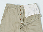 米陸軍において、1950年代に大戦中より引き続き夏季、及熱帯地用として採用、支給されていたコットン素材の通称『チノパンツ』。仕様はボタン類は全て尿素ボタンとなった2ndモデル。通称『M-1943型』(製造は1942年より)の戦後製造品。
