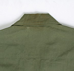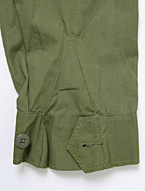 ベトナム戦時において採用、支給を開始されたコットンポプリン素材熱帯地用野戦服、通称『ジャングルファティーグ』。一般に、初期、中期、後期の3タイプに大別される内の後期(3rd)モデル。外観上はファティーグジャケット最終型でもある通称R/S(リップストップ)タイプと同仕様。相違点ば襟首部にハンガー用ループがある点。また、本品が1965〜66年コントラクトの為、2ndタイプと同じ袖口アジャスト部分の別パーツ縫い付け仕様なのが、後期型の特徴。