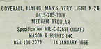 US K-2B サマー・フライングスーツ、MIL-C-6265E