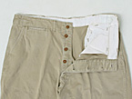 米陸軍において、1950年代に大戦中より引き続き夏季、及熱帯地用として採用、支給されていたコットン素材の通称『チノパンツ』。仕様はボタン類は全て尿素ボタンとなった2ndモデル。通称『M-1943型』(製造は1942年より)の戦後製造品。ウェスト部の拡張あり。
