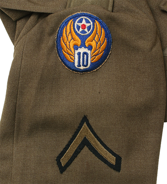 大戦AAF(米陸軍航空隊) において使用された兵/下士官用ウール制服、上衣。一等兵(Private)着用品。C.B.I章、第10陸軍航空隊パッチを含む各種インシグニア付き。実物極上品。