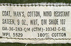 COAT,MAN'S, COTTON,WIND RESISTANT SATEEN, 9 OZ, WRT,QM SHADE 107