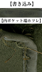 ●内側ポケット両端:ノーメックス製の糸の特製による些細なホツレ箇所あり/右下画像下段参照