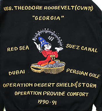 ◇中央のミッキーを中心に、艦名、寄港地や年次、参加作戦名等が背面にダイレクト刺繍された湾岸戦時のカスタムジャケット!! コレクターズ・アイテム!!