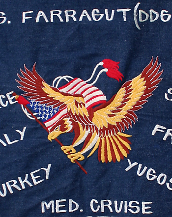 1970年代における米海軍ミサイル駆逐艦『 FARRAGUT(DDG-37) 』のデニム素材製 MED.CRUISE 1977カスタム・ジャケット。背面全体に刺繍あり。実物・極上品。