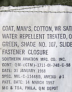 ■制式名称:COAT, MAN'S, COTTON, WR SATEEN, WATER REPELLENT TREATED, OLIVE GREEN, SHADE NO.107, SLIDE FASTENER CLOSURE