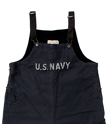 大戦米海軍において、採用、支給されていたブルーカラーでサイドの開閉金具がフック式の大戦後期仕様のデッキ・パンツ。本来は同仕様のジャケットとコンビで着用。本品はプリントラベルタイプ。金属部分に錆の発生等あり。実物極上品。