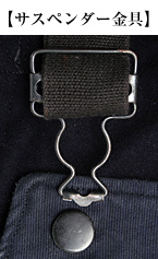 ■サスペンダー:縫い付け固定式(スライド・バックル部を兼ねたフロント金具部により長さ調節。前側のみ着脱可能/右下画像参照)