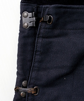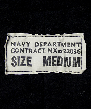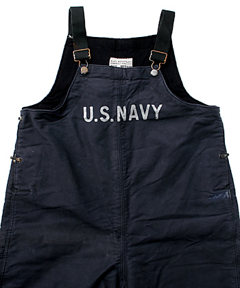 大戦米海軍において、採用、支給されていたブルーカラーでサイドの開閉金具がフック式の大戦後期仕様のデッキ・パンツ。本品はラベルがプリント仕様で両サイドの開閉金具部の雌側がハトメ穴式となった2nd仕様と考えられる一品。本来は同仕様のジャケットとコンビで着用。実物Used品。