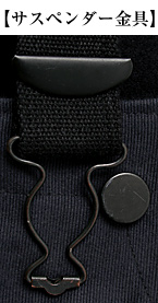 ■サスペンダー:縫い付け固定式(スライド式ストッパー部により長さ調節。前側のみ着脱可能/右下画像参照)