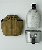 大戦時米軍において採用、支給されていた金属製のキャンティーン(水筒)とカップにコットン製カバー(カーキ色)のセット。本体とカップはWWI時(1918年)製造品。実物USED品。