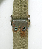 実用には問題無いと考えられるコンディションの物をご案内しておりますが、ご案内品は実際に戦地や任務で使用された実物USED品です。使用又はコレクションに差し支えない若干の色落ち、小汚れ、小傷やフック金具等の金属部分にサビ、緑青の発生及び本体の一部にサビ汚れの移り箇所(右下画像参照)、小リペア跡等がある事は当然の事と予めのご理解ご了承、願います。